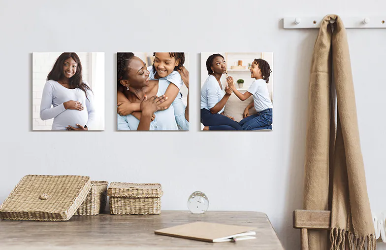 Photo tiles are individual photos printed on small, square panels that you can arrange on your wall to create a personalised collage.