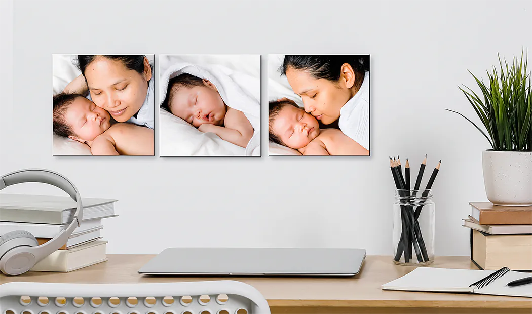 Photo tiles are individual photos printed on small, square panels that you can arrange on your wall to create a personalised collage.